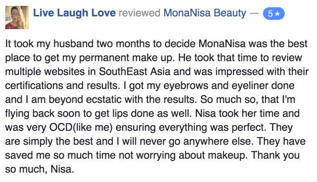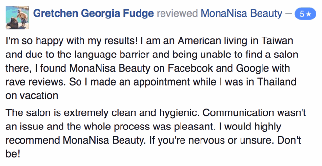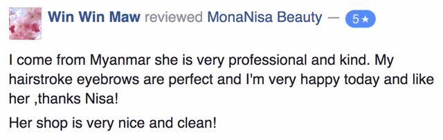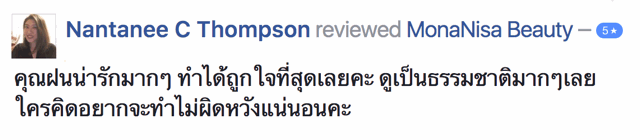 คอมเม้นท์จากใจ อยากจะบอกว่า ได้ไปสักปากที่ร้านร้านหนึ่งในห้างเซ็นทรัลฯ มา ซึ่งเป็นร้านที่ดูดีมาก ราคาค่อนข้างแพงกว่าคุณฝนเท่าตัวและได้เกิดการเปรียบเทียบถึงคุณภาพในทุกด้าน ไม่ว่าจะเป็นผลิตภัณฑ์ที่ใช้ การบริการ หรือผลลัพธ์ที่ได้ มันช่างแตกต่างกันมากเหลือเกิน คุณฝนใส่ใจลูกค้าทั้งก่อนทำ ตอนทำ และหลังทำเสร็จมากๆ ผลิตภันฑ์รวมถึงเครื่องมือทุกชิ้นเป็นของมีคุณภาพและสะอาดปลอดภัยมากๆ และคุณฝนก็มีเทคนิคการทำที่สามารถทำให้คุณได้ผลลัพธ์ที่ดีจริง เพราะเขามีพรสวรรค์ด้านนี้จริงๆ เรารู้ได้เลยว่าเวลาทำกับคุณฝน เธอไม่ได้ทำเพราะมันเป็นหน้าที่ แต่เธอทำด้วยใจพราะใจรัก ดังนั้นผลลัพธ์ที่ได้ก็ไม่เคยทำให้มีคำว่าผิดหวัง เราไม่ได้สักแค่ปากกับคุณฝนนะ ส่วนอื่นเราก็ทำ และก็ประทับใจกับผลลัพธ์ที่ได้ คนที่ทำมาใหม่ๆ ถ้าสียังไม่ถูกใจเท่าไหร่ ขอให้รอนิดนึง บางทีครั้งแรกอาจจะดูเหมือนออกมาโอเคแต่ยังไม่ถูกใจมาก แต่พอถึงเวลาว่าสีมันคือสีนี้แน่นอนแล้วจะถูกใจมาก ถ้าเป็นปากอาจจะสองสามเดือน แบบว่าสีที่ได้มาที่ว่าเดือนแรกถูกใจ โอเคอยู่นะ แต่พอสองสามเดือน สี่ห้าเดือนต่อมา ถูกใจมากกว่านั้นอีก มีคนทักว่าทาลิปของอะไรเราบอกไม่ได้ทาสักสีปากมา เขาก็บอกว่าเขาสักเหมือนกันที่อื่นแต่ทำไมสีไม่สวยเหมือนของโมนาเขาเสียใจมาก ใครสนใจก็ลองใช้บริการเธอดูนะ อย่างน้อยที่สุด คุณไม่เสียน้ำตาเพราะความผิดหวังหลังการทำแน่นอน