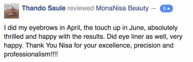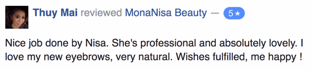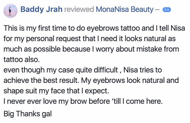 แต่ก่อนเวลาจะออกบ้านไปไหนจะเสียเวลามากกับการแต่งหน้าเพราะคิ้วไม่มี ไม่มีเลยจริงๆๆต้องใช้ดินสอเขียนคิ้วนั่งเขียนวาดคิ้วให้ได้รูปสวยเสียเวลาเป็นชั่วโมง พอล้างหน้า ว้าย!!นึกว่าแม่ชี แต่ตอนนี้มีคิ้วแล้ว สวยแล้ว 55 ตั้งแต่ไปทำคิ้วสามมิติแบบผสมลายเส้นกับน้ำฝนที่ MonaNisa Beauty ตอนนี้คิ้วได้รูปสวย เป็นธรรมชาติมาก จะแต่งหน้าหรือหน้าสด ก็มีคิ้วแล้วค่ะ มั่นใจขึ้นมาก ต้องขอบคุณน้ำฝนมากๆๆเลยนะจ๊ะ ขอบคุณ MonaNisa Beauty ค่ะ