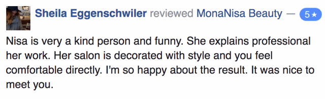 ประสบการณ์ที่น่ารัก, นี่เป็นครั้งที่3 ที่มาร้านนี้และก็แนะนำเพื่อนมาใช้บริการที่นี่ด้วย นิซ่าหรือน้ำฝนต้อนรับคุณอย่างดีเป็นกันเองตั้งแต่ครั้งแรกเลย การบริการที่เป็นมืออาชีพและคุณภาพระดับแนวหน้า รวมไปถึงการไม่หยุดนิ่งที่จะขนขวายหาความรู้อยู่ตลอดเวลาเพื่อที่จะพัฒนาทักษะและยกระดับความรู้ความสามารถในสิ่งที่ทำอยู่ด้วย(เห็นได้จากใบประกาศบนผนังที่ร้านค่ะ แถมยังแซวคุณนิซ่า/น้ำฝนด้วยว่า สงสัยต้องหาผนังใหม่เร็วๆนี้แน่เพราะคงไม่พอ) ภาพก่อนทำหลังทำนั้นมันได้บอกคุณภาพของงานอยู่แล้ว และคุณมั่นใจได้เลยว่าเลือกไม่ผิดที่ตัดสินใจมาใช้บริการที่ โมนานิซ่าค่ะ